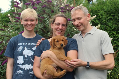 Sie bereichert jetzt das Leben von Martina, Hansi und der Arbeitsgoldendame Tessa. Sie darf, wie Tessa auch, in Zukunft Dummys retten ;-)
